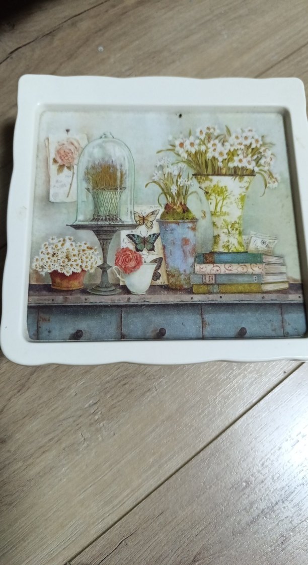 Bu beyaz dekoratif tabak, kitaplar ve kelebeklerle pastel renkli vintage çiçek desenine sahiptir, ev dekoruna zarif bir dokunuş katar.