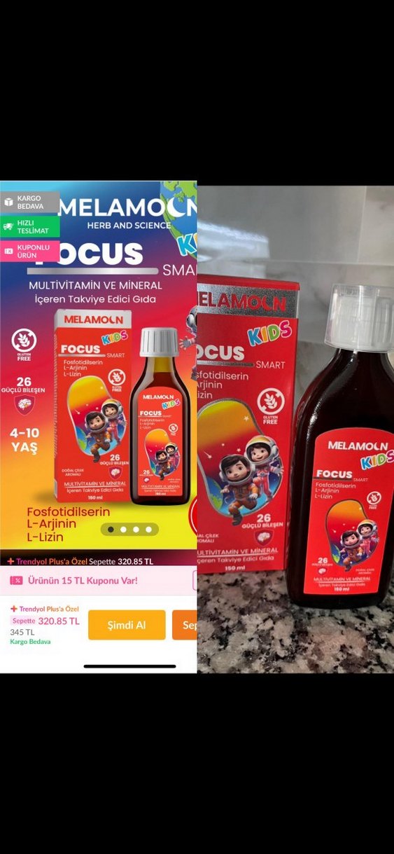 Melamoln Kids Focus, 4-10 yaş çocuklar için fosfotidilserin, L-Arjinin ve L-Lizin içeren renkli multivitamin ve mineral takviyesidir. 150 ml şişede sunulur.