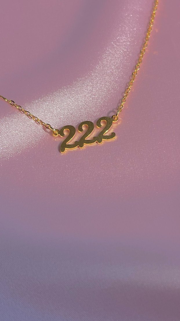 Altın renkli, zincir detaylı ve "222" baskılı kolye.