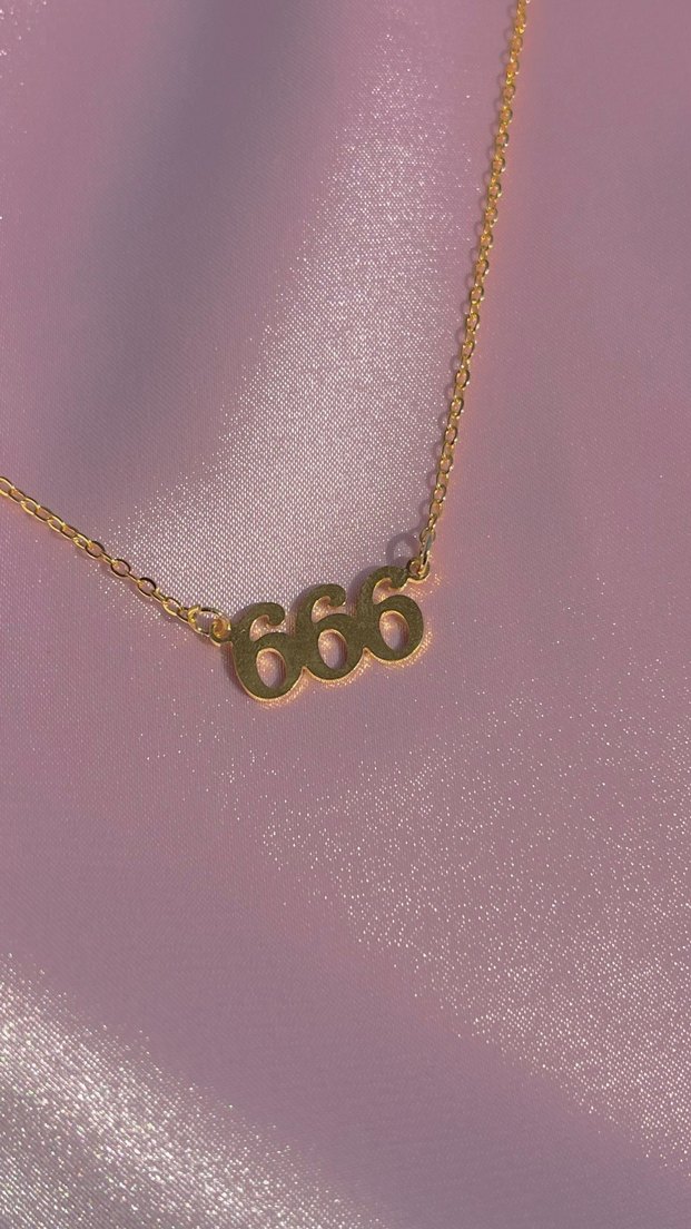 Parlak 666 figürlü, altın renk zincir detaylı kolye