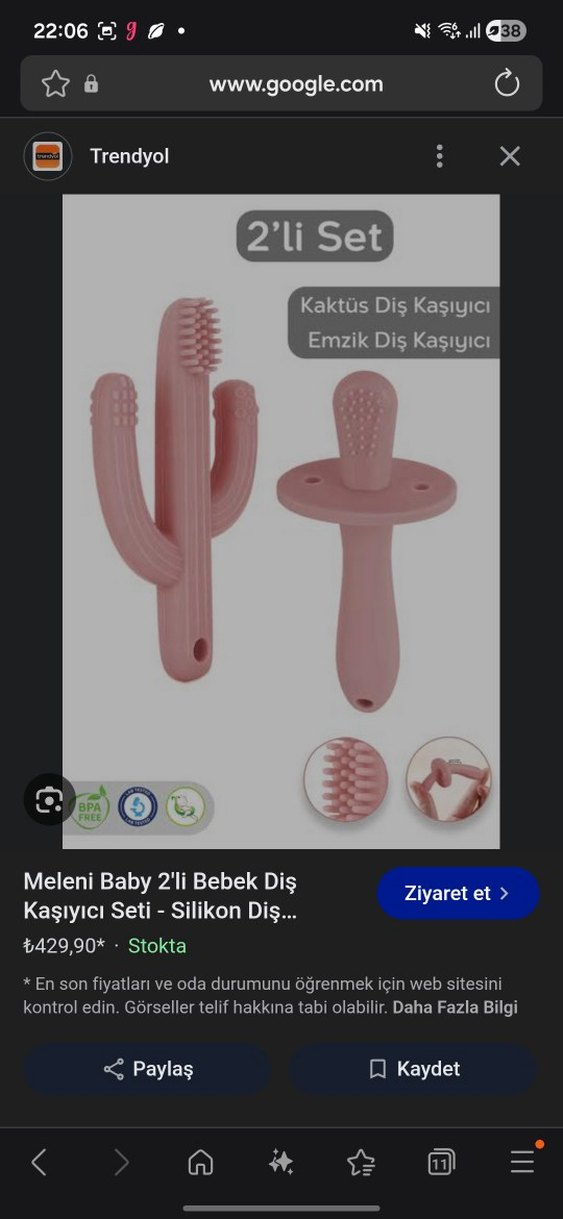 Meleni Baby 2'li set, pastel pembe renkte silikon kaktüs ve emzik şekilli bebek diş kaşıyıcıları içerir. BPA içermez, bebekler için güvenlidir.