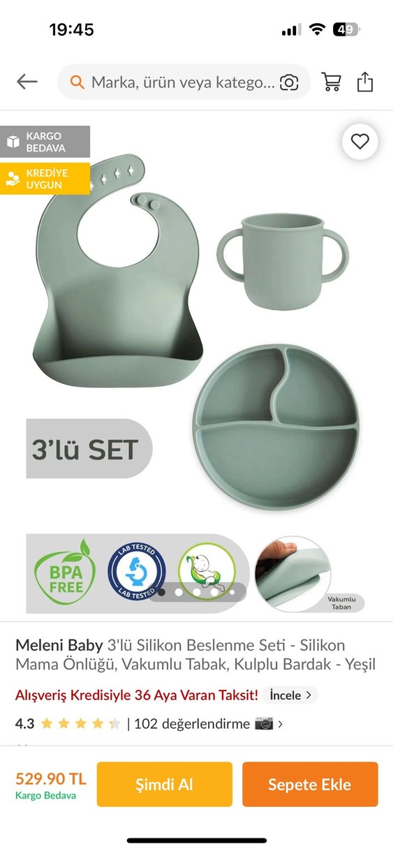 Meleni Baby 3 parçalı silikon beslenme seti; mama önlüğü, vakumlu tabak ve kulplu bardak içerir. BPA içermeyen yumuşak silikon malzeme kullanılmıştır. ️Sağlam. Elimde çok fazla yenidoğan ürün var. Takipte kalın. Mesaj atabilirsiniz. Kendi fotoğraflarını yükleyeceğim.