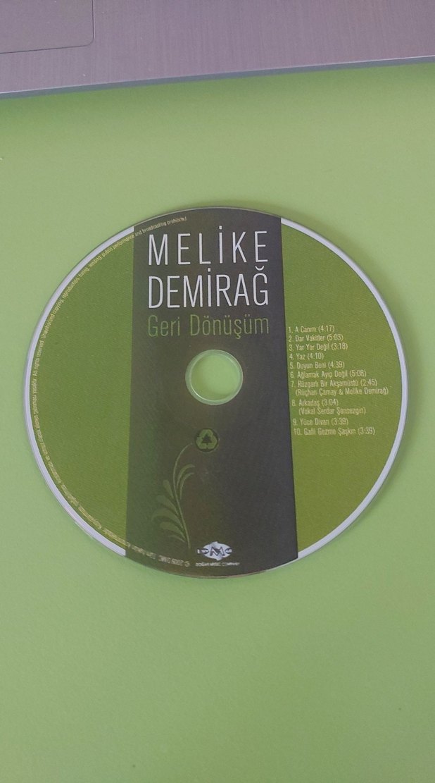 Melike Demirağ'ın 'Geri Dönüşüm' albümünü içeren CD, 10 şarkıdan oluşuyor. Yeşil ve siyah renklerde, şarkı listesi sağda yer alıyor.