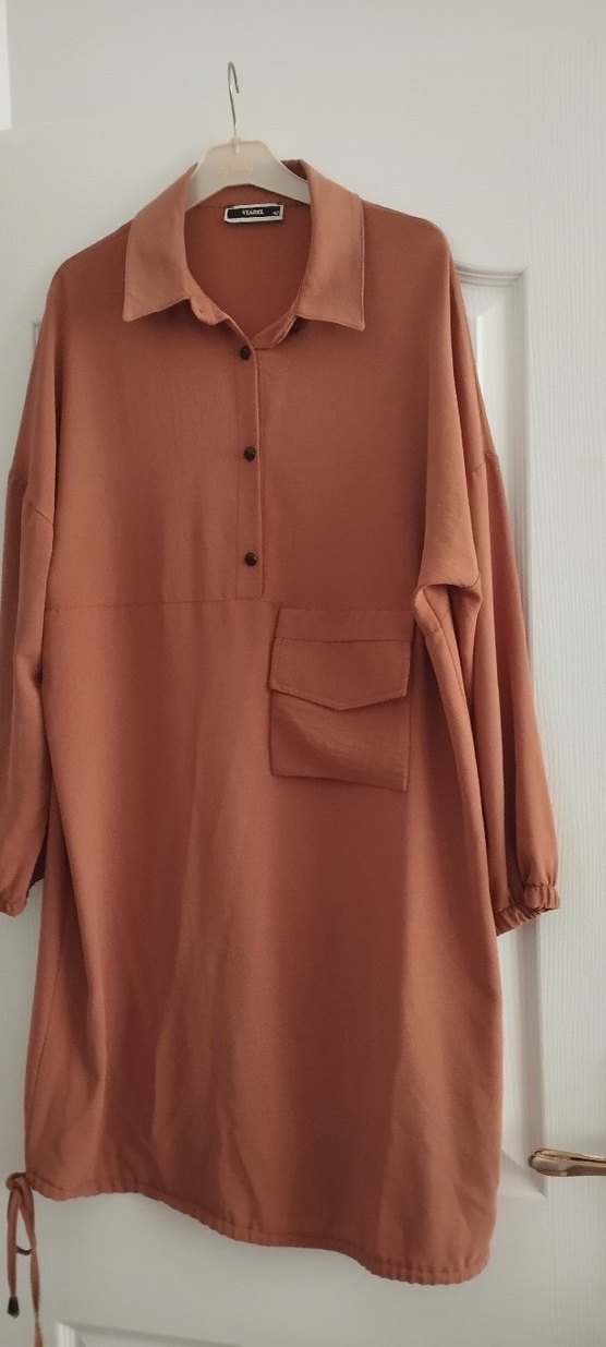 Kahverengi tunik modeli, uzun kollu ve düğmeli olup bol kesimdir. Büyük cep detayına sahip, yumuşak sentetik kumaştan günlük rahat kullanım için uygundur.