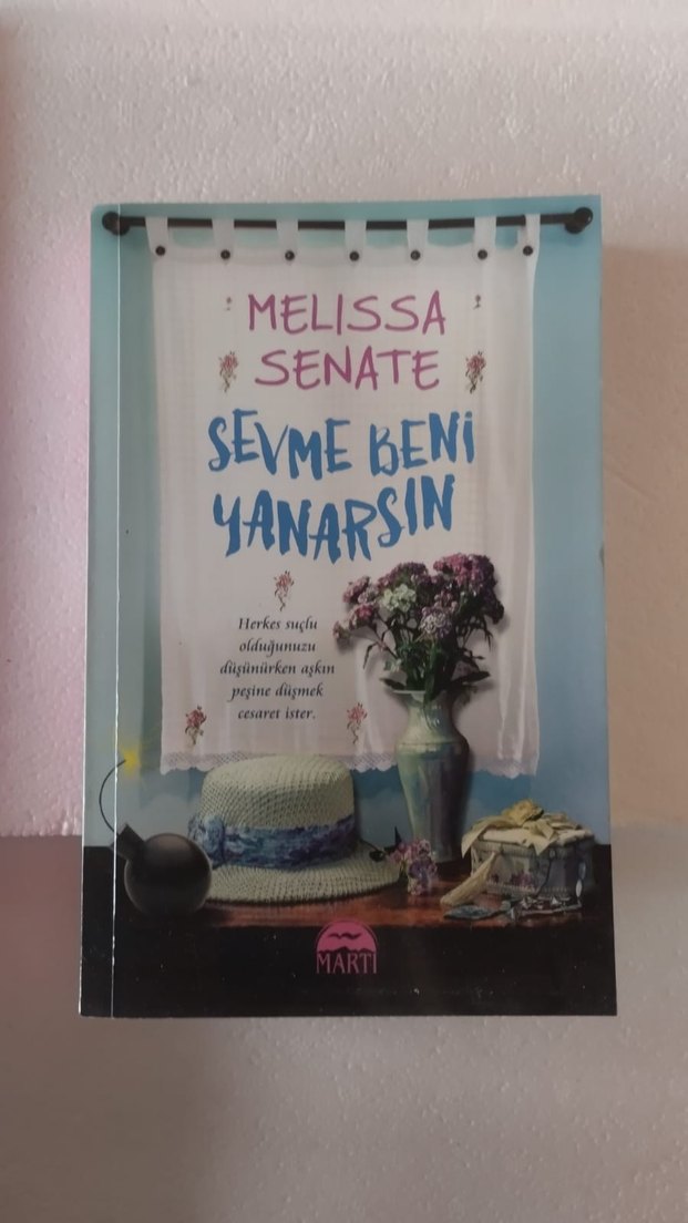 Melissa Senate'nin "Sevme Beni Yanarsın" kitabı, üzerinde başlık ve yazarın olduğu bir perde, çiçekli bir vazo ve masada şapka bulunan kapağa sahiptir.