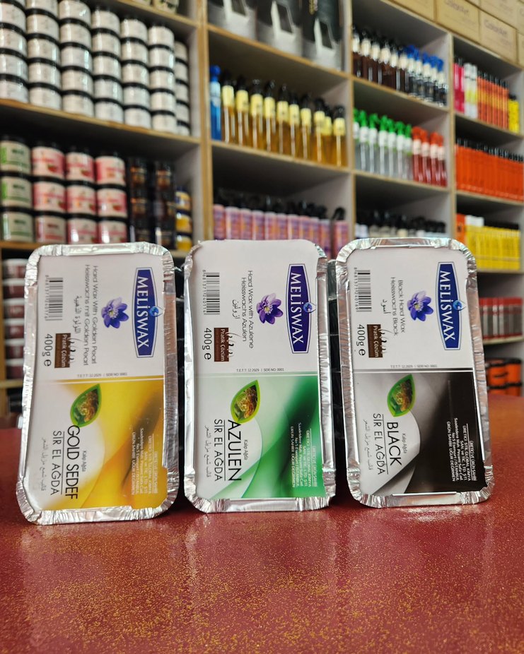 Meliswax ağda kremi seti, 400g'lık Gold Sedef, Azulen ve Black çeşitlerini içerir. Etkili ağda için kullanımı kolay. ️