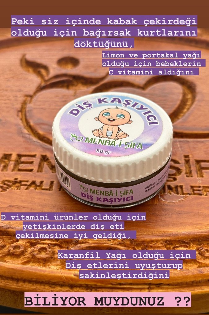 Menba-i Şifa diş kaşıyıcı, kabak çekirdeği, karanfil yağı, limon ve portakal yağı ile C ve D vitamini içerir. Diş etlerini uyuşturup sakinleştirir, bebeklerde C vitamini sağlar, yetişkinlerde diş eti çekilmesine iyi gelir.