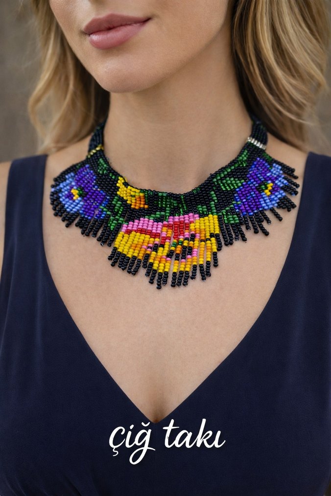 kum boncuk işlemeli ve çok renkli çiçek desenlerine sahip bohem tarzda kolye. Zincir kapamalıdır.