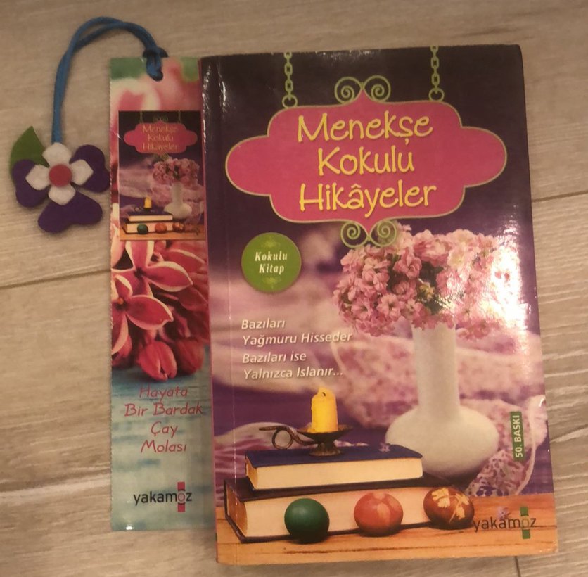 Menekşe Kokulu Hikayeler kitabı, kokulu sayfalar içerir ve yağmurun hissi ile çay molası gibi sakin anları anlatan hikayeler sunar. Yanında uyumlu bir ayraç bulunur.