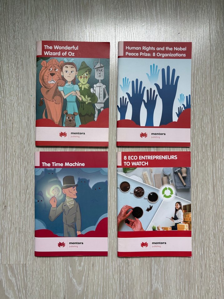 Mentora Yayınları'nın İngilizce kitap seti; Oz'un Harika Büyücüsü, İnsan Hakları ve Nobel Barış Ödülü, Zaman Makinesi ve 8 Ekolojik Girişimci kitaplarını içerir. İngilizce dir.