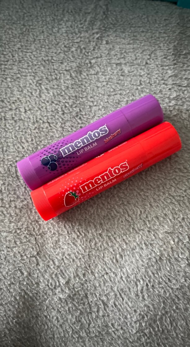 Mor ve kırmızı renklerde Mentos dudak balmı seti. Nemlendirici etkisi ve meyvemsi kokusu vardır. Hollanda’dan aldım. İkisi de hiç kullanılmadı.