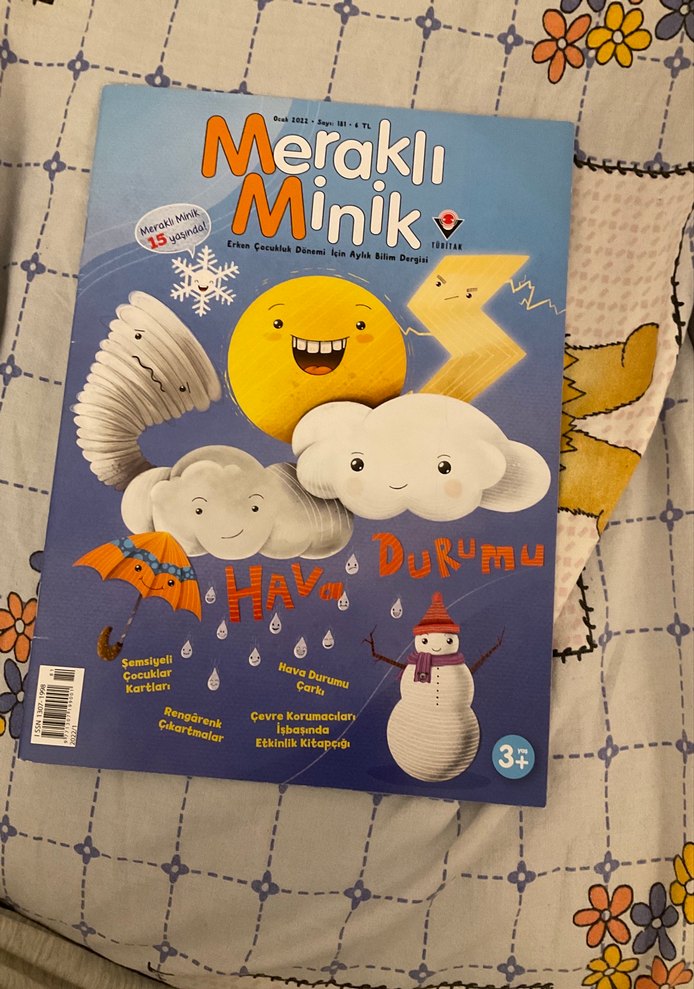 Meraklı Minik, hava durumu konulu renkli çizimler ve eğlenceli etkinlikler içeren 3 yaş ve üzeri çocuklar için bir kitap. ☁️
