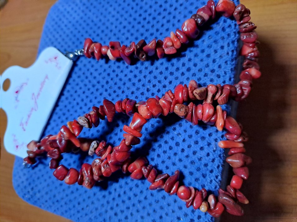 Renkli batik desenli, uzun kırmızı boncuklardan oluşan bohem tarzda kolye.