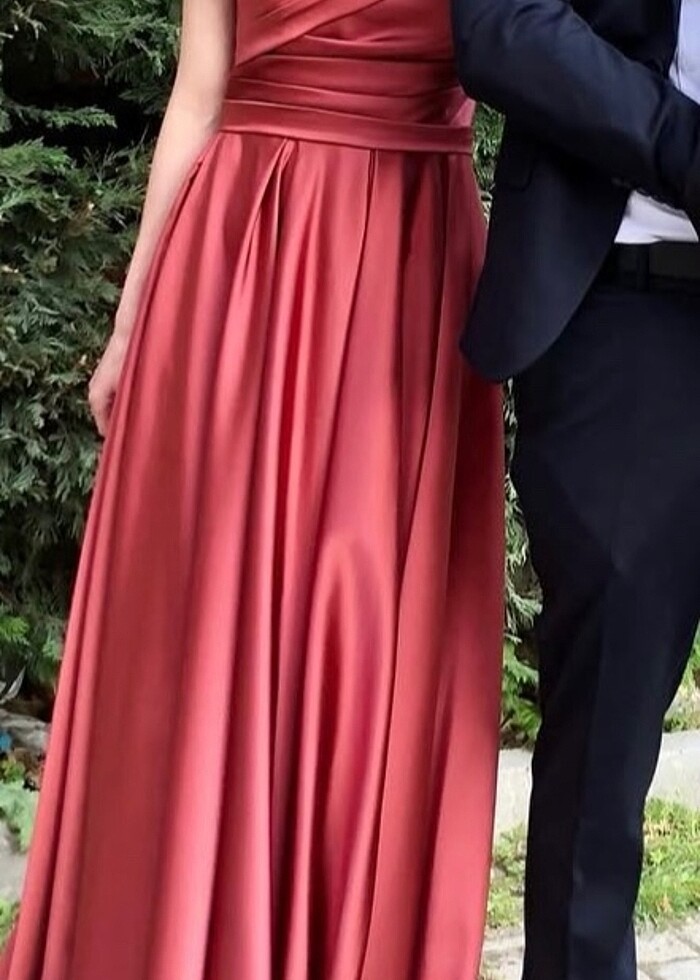 Mercan rengi uzun saten abiye elbise bir defa giyildi çok şık bir duruşu var .