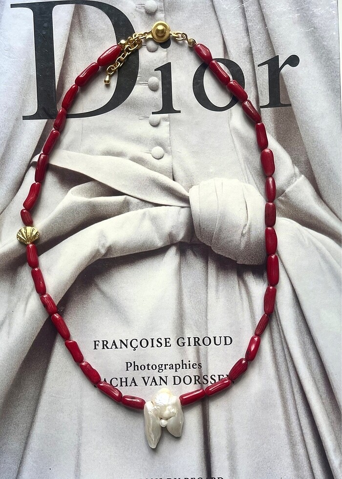 Gerçek mercan ve Barok inci kullanılmıştır. 14 K kaplama ara parçalar kullanılmıştır .