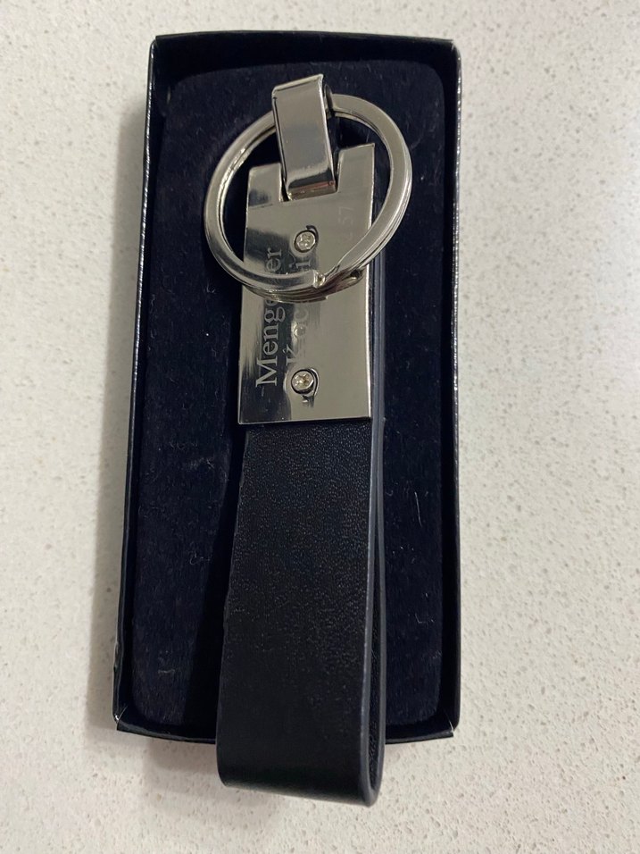 Siyah deri kayış ve gümüş metal halka ile klasik şıklığı ve bisikletçi tarzını birleştiren erkek anahtarlık. Siyah kutusunda, Paris karanlık tonlarında.