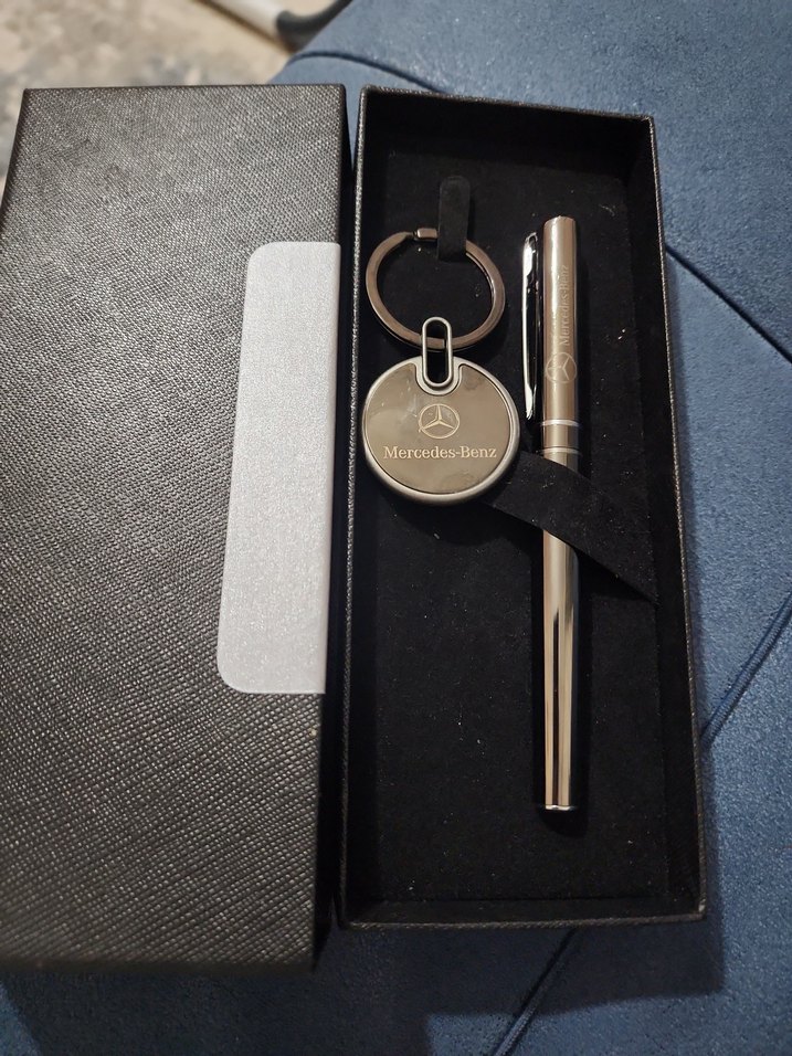 kalem ve Mercedes-Benz logosu bulunan yuvarlak anahtarlık, siyah dokulu kutuda sunulmaktadır. ✒️