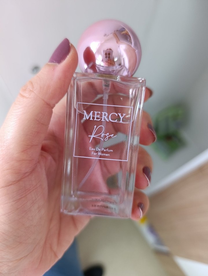 Mercy Rose, pembe küresel kapaklı şeffaf şişede kadınlar için eau de parfum. Çiçeksi koku sunar.