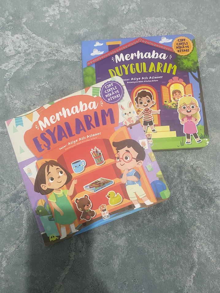 Renkli çizimlerle 'Merhaba Eşyalarım' ve 'Merhaba Duygularım' adlı çocuk kitapları, çift ciltli ve açılır kapaklı .