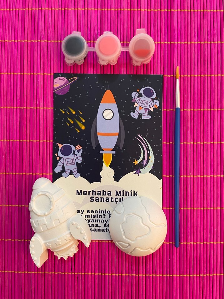 Merhaba Minik Sanatçı adlı uzay temalı boyama kitabı, üç renk boya, fırça ve boyanabilir iki 3D obje içerir.