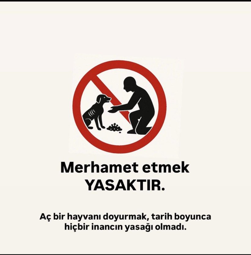Merhamet etmek yasaktır uyarı levhası, aç hayvanı doyurmanın hiçbir inançta yasak olmadığını belirten metinle birlikte.