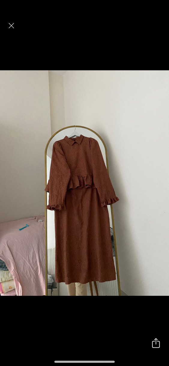 Uzun kollu, yüksek yakalı ve işlemeli desenli kahverengi keten elbise. Bol kesim ve fırfır detaylı, bohem vintage tarzda günlük kullanım için uygundur.