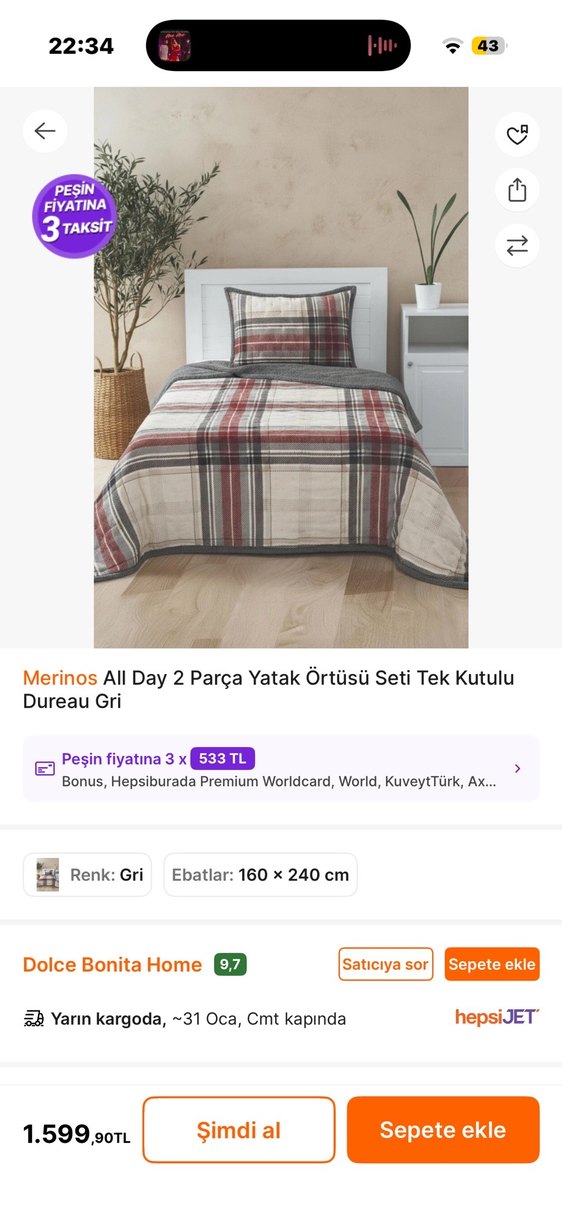 Merinos 2 Parça Yatak Örtüsü Seti tek kişilik 0 paketli