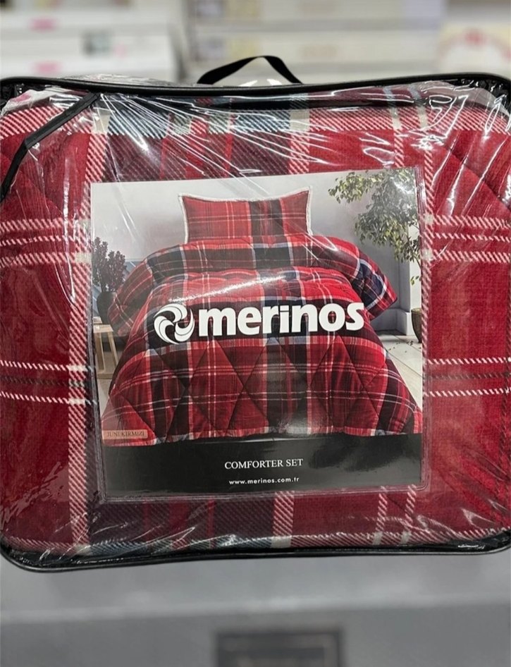 Merinos markasına ait koyu kırmızı ekose desenli yorgan seti. Yorgan ve uyumlu yastık kılıflarını içerir, yatak odanıza sıcaklık ve şıklık katar. ️