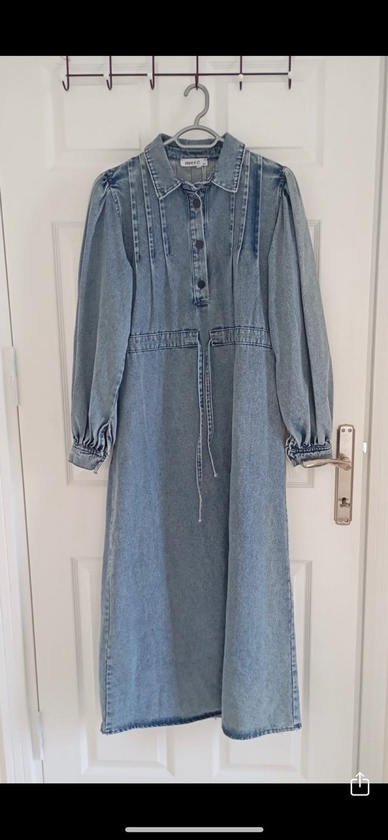 Kot kumaştan uzun elbise, yakalı ve manşetli uzun kollu. Belden kemerli, rahat kesimli vintage normcore tarzında, günlük kullanıma uygun. Bir defa kullanıldı
