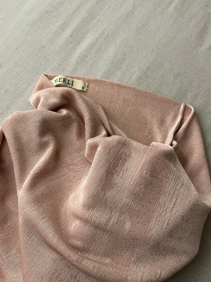 MERLi markalı, bej renkli keten kumaştan yapılmış pliseli kadın straplez üst. Rahat ve bohem tarzıyla dikkat çekiyor.