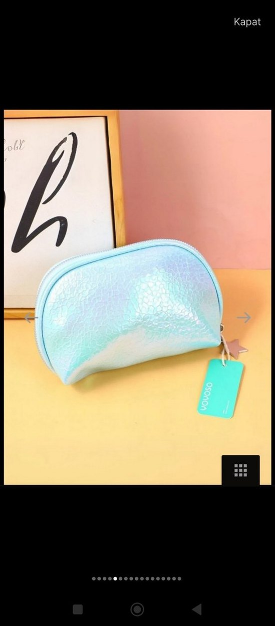 Holografik nil yeşili mermaid balık pulu desenli, parlak yüzeye sahip ve fermuarlı kadın makyaj çantasıdır. Plastik malzemeden yapılmıştır, bohem ve göz alıcı tarzlara uygundur. Hiç kullanılmadı.