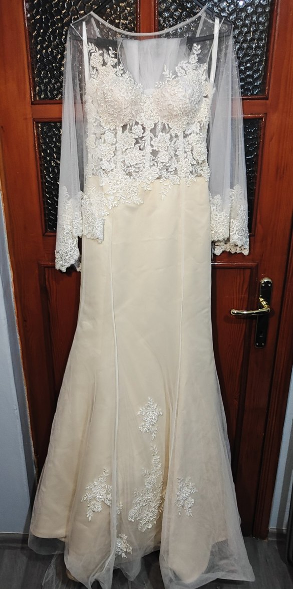 Yarasa Kollu, Straplez Yakalı Bej Detay Gelinlik. Vintage Dantel Detaylı, A-kesim, Mermaid Gelinlik. Ürün Tertemiz, Gamboçuyla bekliyor.