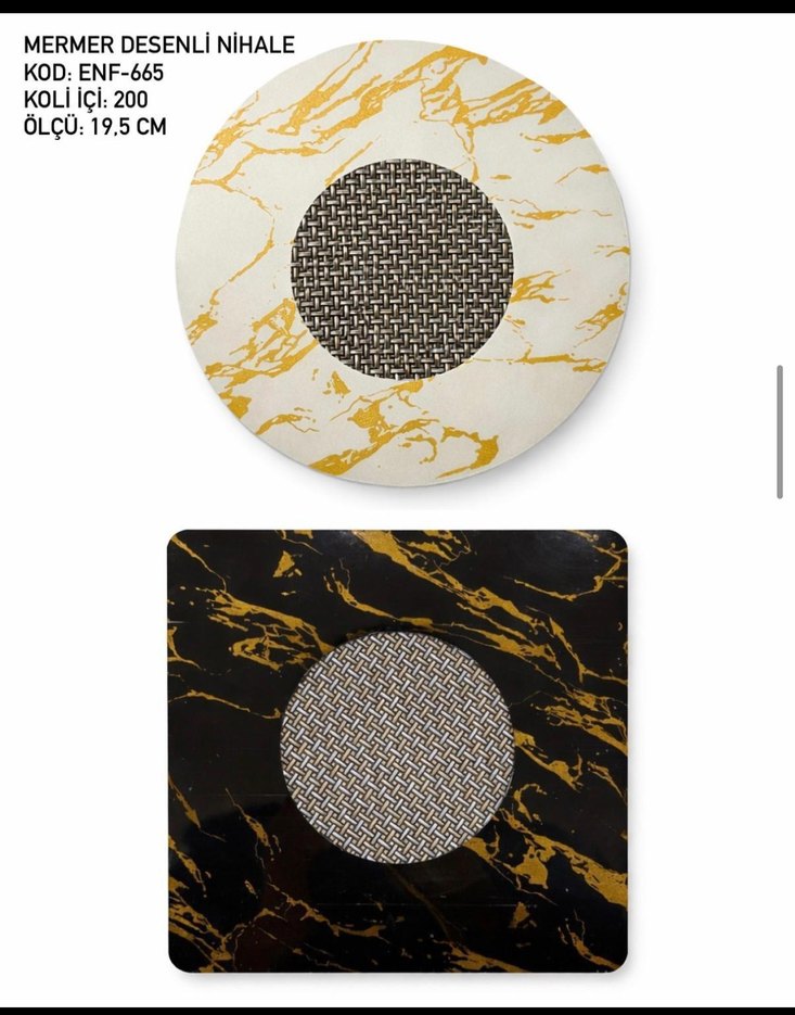 19,5 cm çapında, koyu altın renkli mermer desenli ve dokulu merkezli yuvarlak nihale. Masanıza şık bir görünüm kazandırır. ️