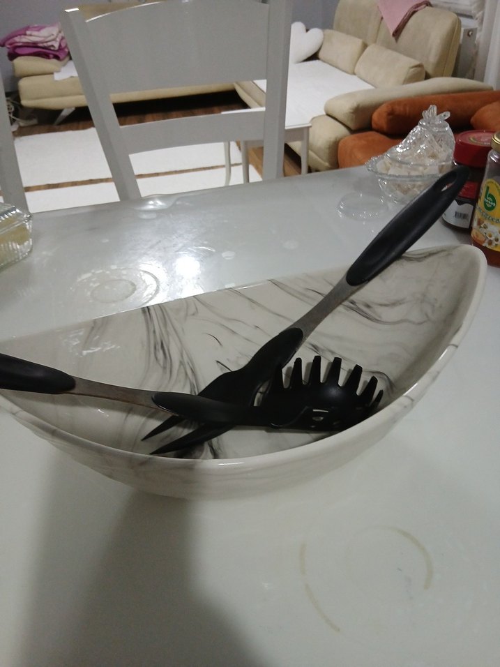 Mermer desenli beyaz ve gri servis tabağı, yiyecek sunumu için uygun. Pürüzsüz yüzey ve zarif kıvrımlı şekle sahip. ️