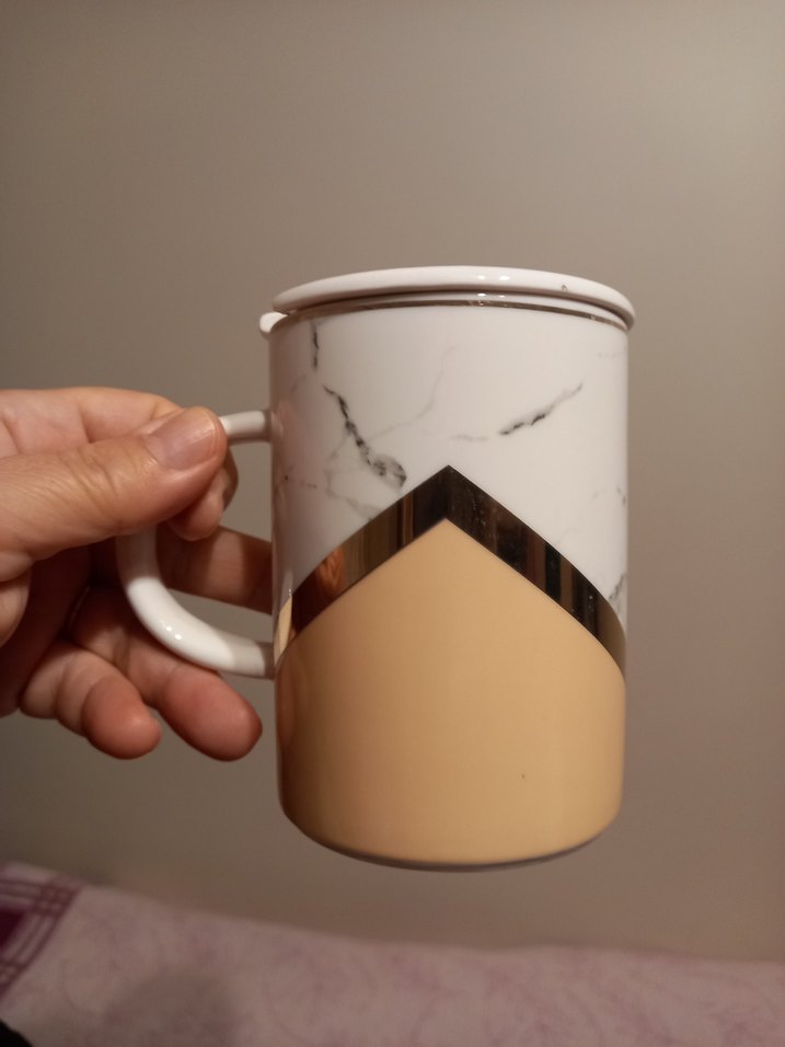 Mermer desenli ve kapaklı seramik kupa, bej ve gri renklerde metalik detaylı.