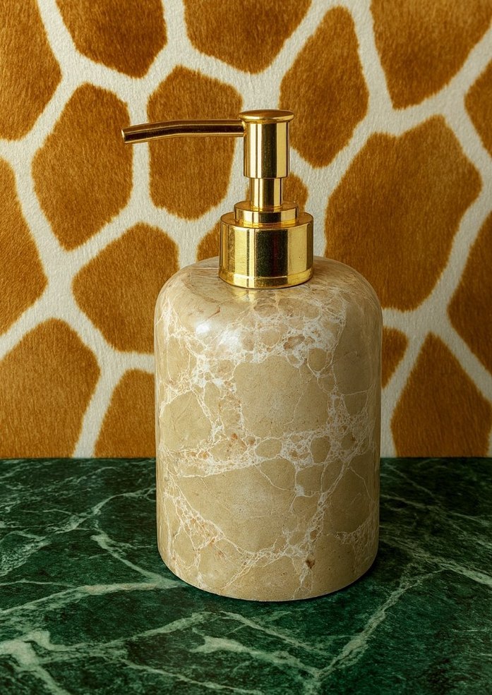 Mermer ve altın renkli pompalı sıvı sabunluk, kolay kullanım sağlar. ,(antalya patara bej mermerden üretilmiştir