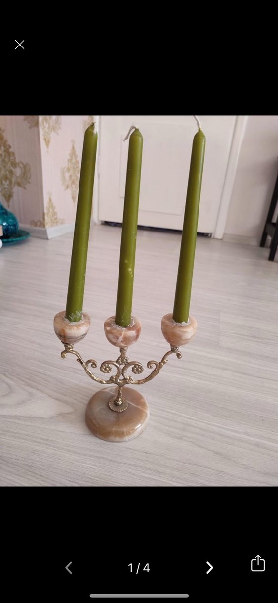 Pirinç ve Mermer tabanlı, üç kollu ve khaki renk mumların yer aldığı şık ve sağlam metal detaylı mumluk. ️