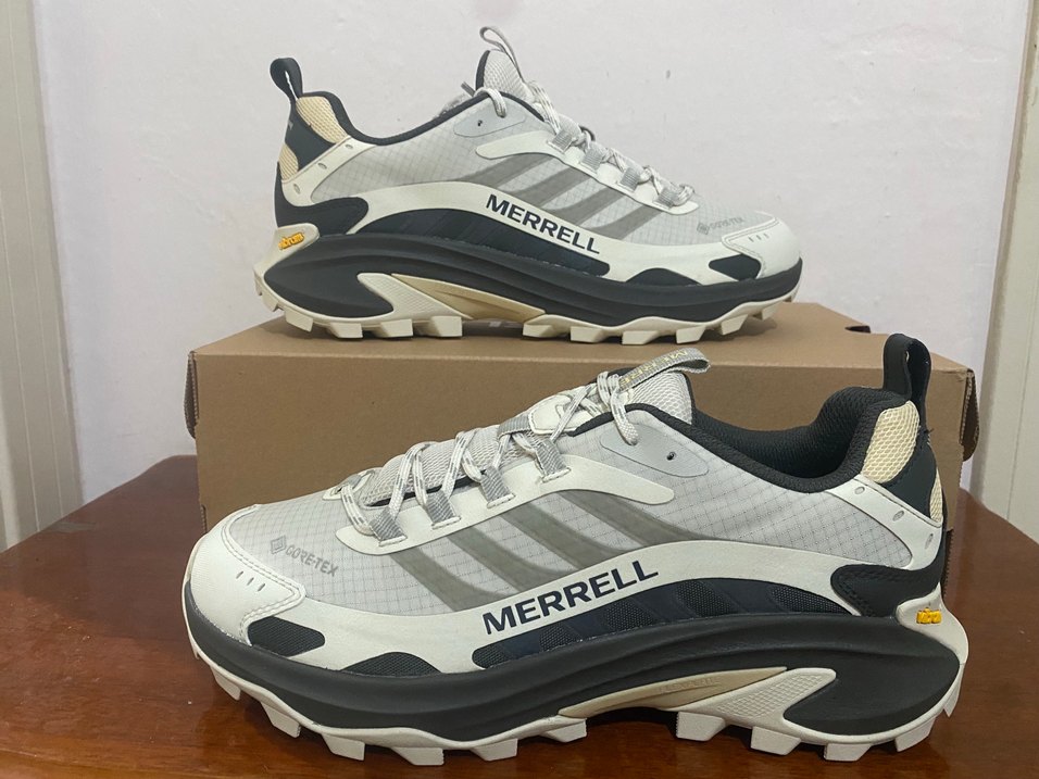 Merrell erkek outdoor spor ayakkabılar, canlı gri ve beyaz renklerde, baskılı detaylıdır. Bağcıklı, kauçuk tabanlı ve Gore-Tex korumalıdır.