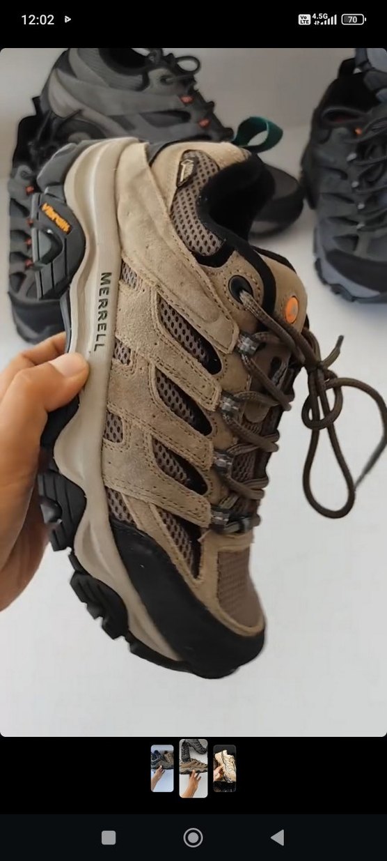 Merrell marka kahverengi ve gri yılan desenli erkek outdoor ayakkabı, kauçuk tabanlı ve bağcıklı, trend sokak stili için uygun.
