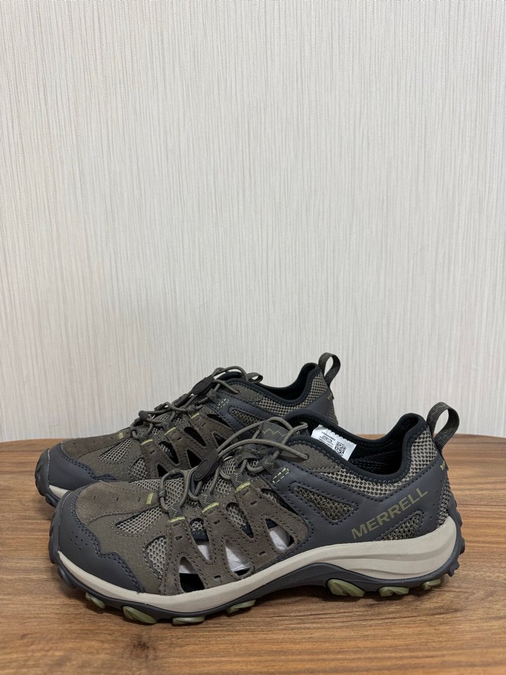 Merrell erkek outdoor ayakkabılar, gri ve kahverengi renklerde, kauçuk tabanlı ve bağcıklı tasarıma sahiptir, sokak stili ve günlük dış mekan kullanımı için uygundur.
