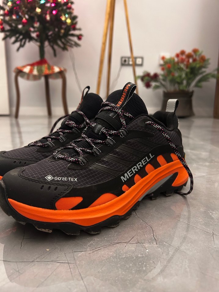 Merrell erkek outdoor ayakkabılar, bağcıklı, koyu turuncu ve siyah baskılı desenli, kauçuk tabanlıdır. GORE-TEX su geçirmez özelliklidir. Kasım ayında SPX mağazasından faturalı alınmıştır.