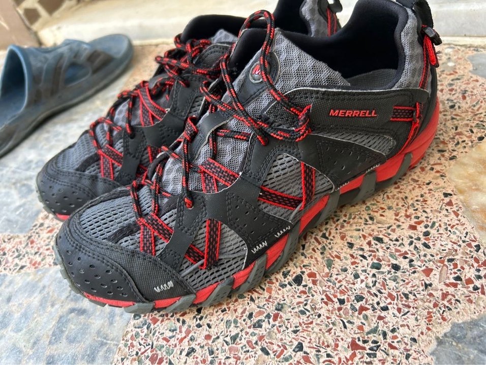 Merrell erkek outdoor ayakkabısı, bağcıklı, kauçuk tabanlı ve kırmızı-gri yılan desenli. Spor ve trend günlük kullanım için uygundur. ️