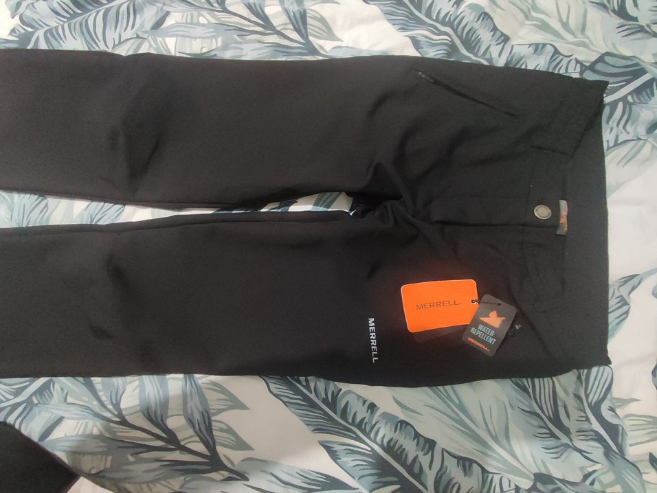 Merrell markalı, fermuarlı ceplere sahip, sentetik kumaştan yapılmış siyah erkek kayak pantolonu. Sokak stili ve açık hava aktiviteleri için uygun, baskılı tasarım.