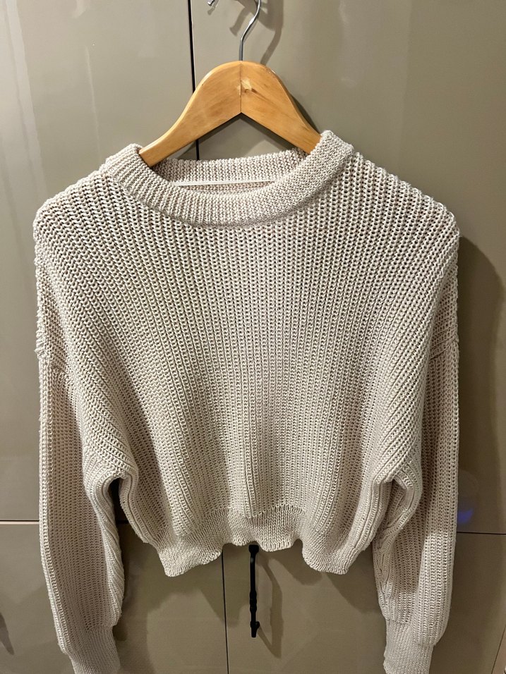 Bu bej renkli triko kadın kazak, bisiklet yaka ve uzun kollu, bol kesim ve normal midi uzunluğundadır, gündelik sokak stili için uygundur. crop yumuşak merserize