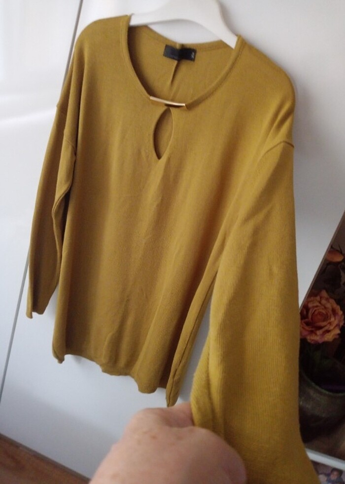 İki kol arasi 63 cm,m bdn yaziyor ama 44 beden rahatlıkla giyer.yan alt kisminda az tuylenme var.