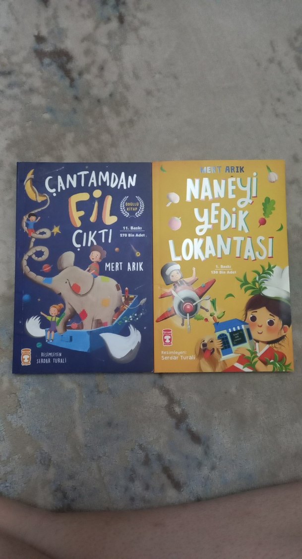 Mert Arık'ın 'Çantamdan Fil Çıktı' ve 'Naneyi Yedik Lokantası' adlı, renkli çizimlere sahip iki çocuk kitabı. çok beğenerek okuduk. umarım alan çocuğumuz da beğenerek okur. kitaplar tertemiz.
