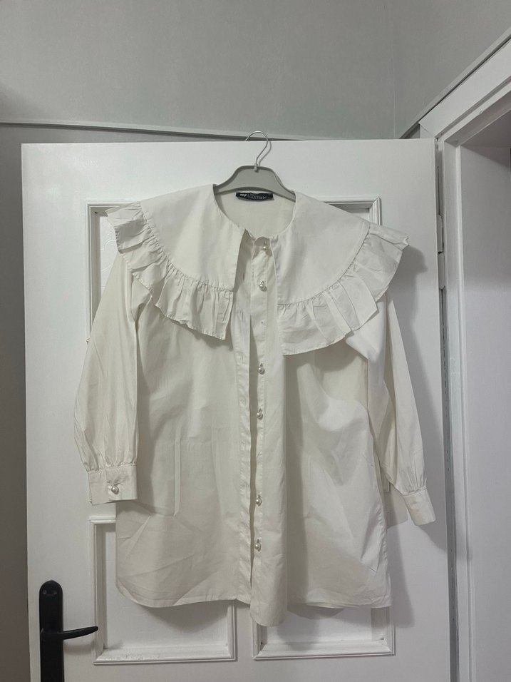 Beyaz keten kumaştan, yakalı ve fırfırlı detaylı, uzun kollu, midi boy bol kesim kadın gömlek. 1 beden