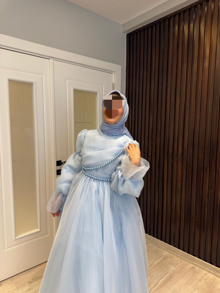 38-42 beden uyumlu tarih belirtiniz rezerve için özel dikim isterseniz 7500 TL ye istenilen renk dikilir Bu mavi uzun abiye elbise, yüksek yakalı ve uzun kolludur. Transparan detaylar ve incilerle süslenmiştir, düğünler için uygundur.