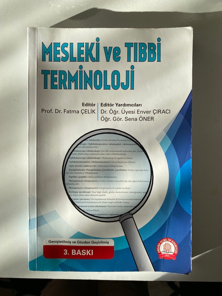 Prof. Dr. Fatma Çelik editörlüğünde, Enver Çıracı ve Sena Öner katkılarıyla hazırlanmış mesleki ve tıbbi terminoloji kitabının genişletilmiş 3. baskısı. 292 sayfa kitabın 167. Sayfasına kadar kullandım fakat her sayfası ilk görseldeki gibi kalemle çizilmedi çoğunluk 8. Görseldeki gibi kullanıldı herhangi bir şekilde yırtılma yok göründüğü gibi.