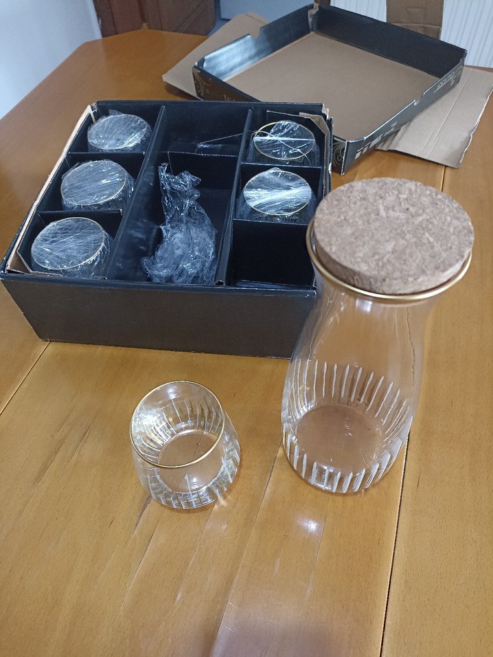 Tıpalı cam sürahi ve 6 adet bardak içeren set. Markası ESBEYCAM. Hiç kullanılmadı.